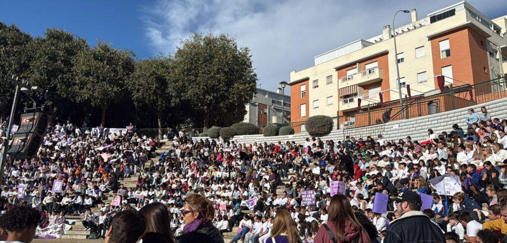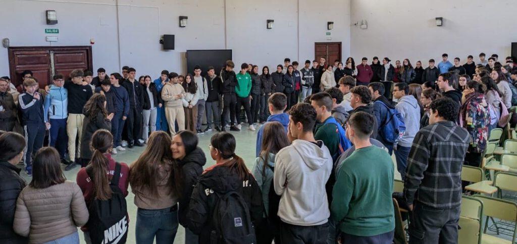 El alumnado de 1º de la ESO, junto a sus tutores, se unió al alumnado del CEIP San Mateo y, juntos, llegaron hasta el Parque Centro de Alcalá, donde se reunieron con los estudiantes de más de una docena de centros de la localidad. Allí, escucharon un manifiesto que abogaba por el fin de violencia machista y, cada centro, realizó su aportación a la acción colectiva.