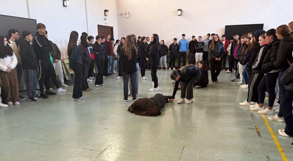 En el marco de la conmemoración de esta efeméride del 25 N, los alumnos de 1º de Bachillerato realizaron en el Salón de Actos del instituto, una actuación con la que reivindicaron el fin de la violencia hacia la mujer. El grupo de alumnas, procedente de 1º de Bachillerato A, B y D, desarrolló una actuación en la que recrearon, de forma teatralizada, la violencia que experimentan las mujeres.