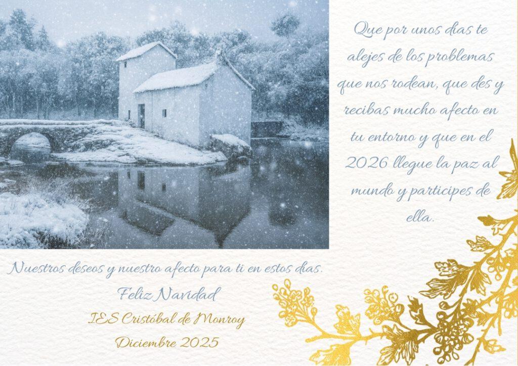 ¡Felices fiestas! por Isabel López Cepero | Dic 15, 2025 | Noticias, Vida en el centro | 0 Comentarios Compártelo en tus redes Ambiente navideño en el Instituto Cristóbal de Monroy. Departamento de Francés Departamento de Comercio BIBLIOTECA ; Un deseo navideño: Compártelo en tus redes Enviar comentario Cancelar la respuestaTu dirección de correo electrónico no será publicada. Los campos obligatorios están marcados con *Comentario * Nombre * Correo electrónico * Web Guarda mi nombre, correo electrónico y web en este navegador para la próxima vez que comente.