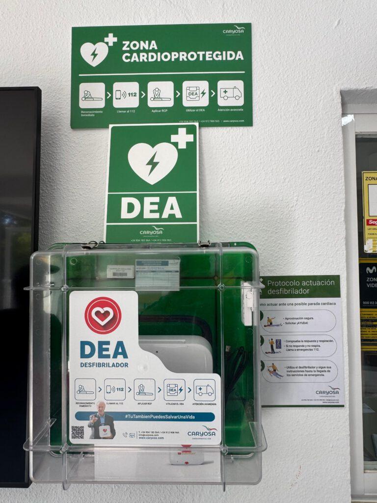 Nuestro desfibrilador se encuentra en la planta baja, al lado de conserjería. Ahora tendremos que hacer los cursos para aprender a usarlo.