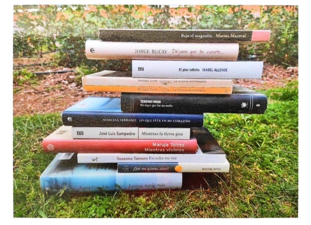 2️⃣ Coloca los libros uno encima de otros tal y como se ve en la foto, de tal manera que se pueda leer bien el titulo en el lomo. Ordénalos según como quieras que se lea tu poema (empezando siempre de arriba a abajo)
