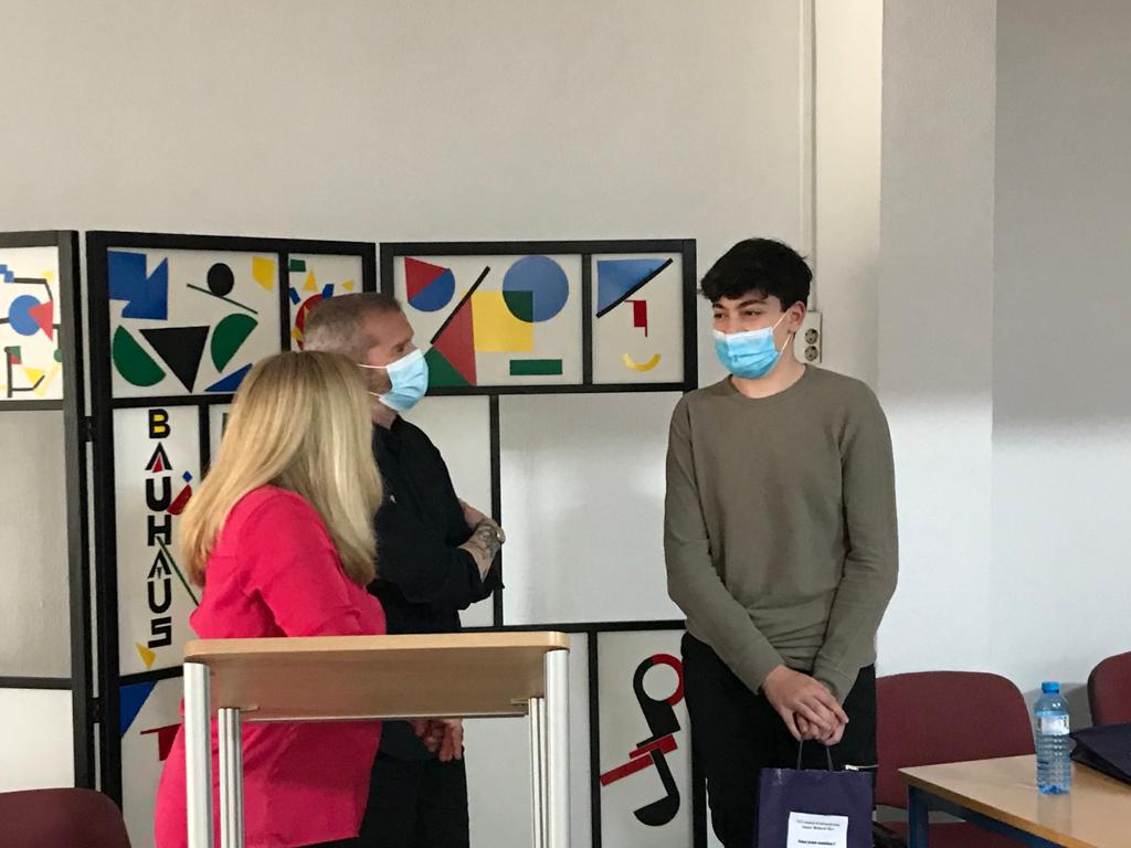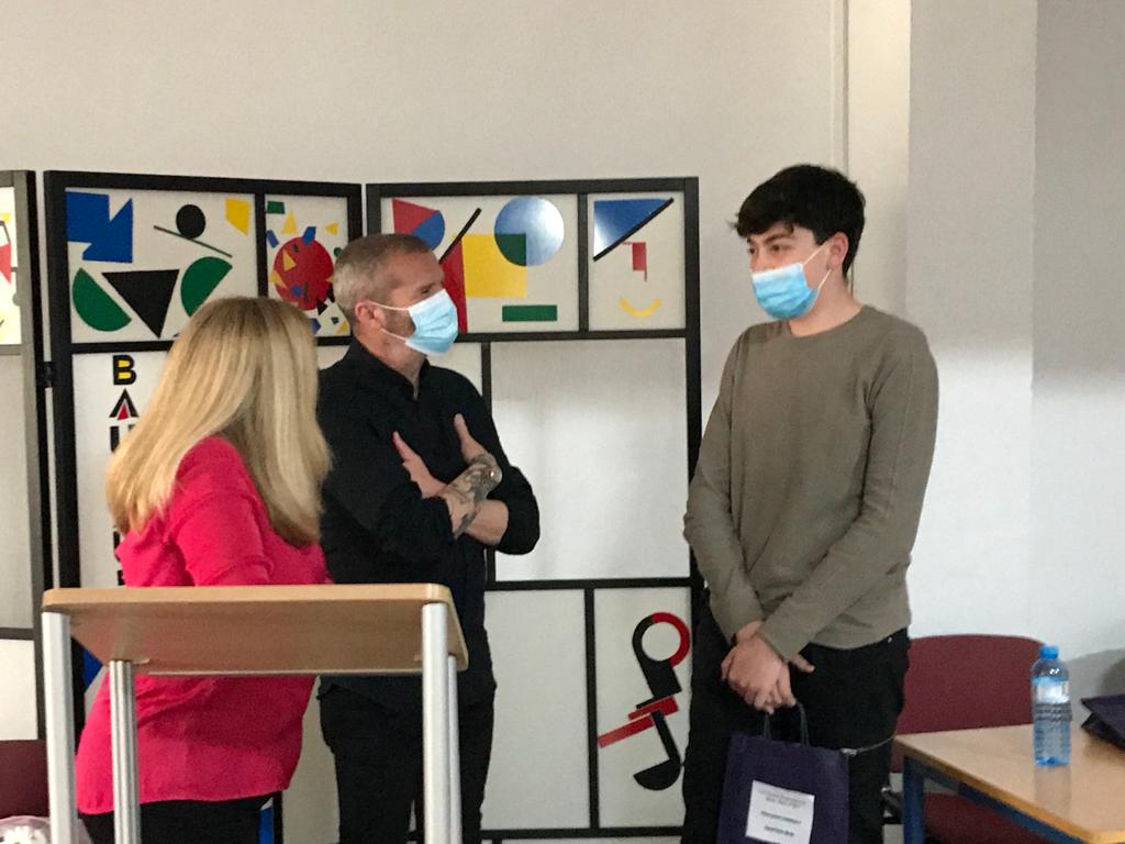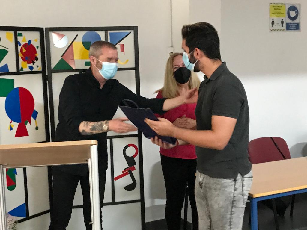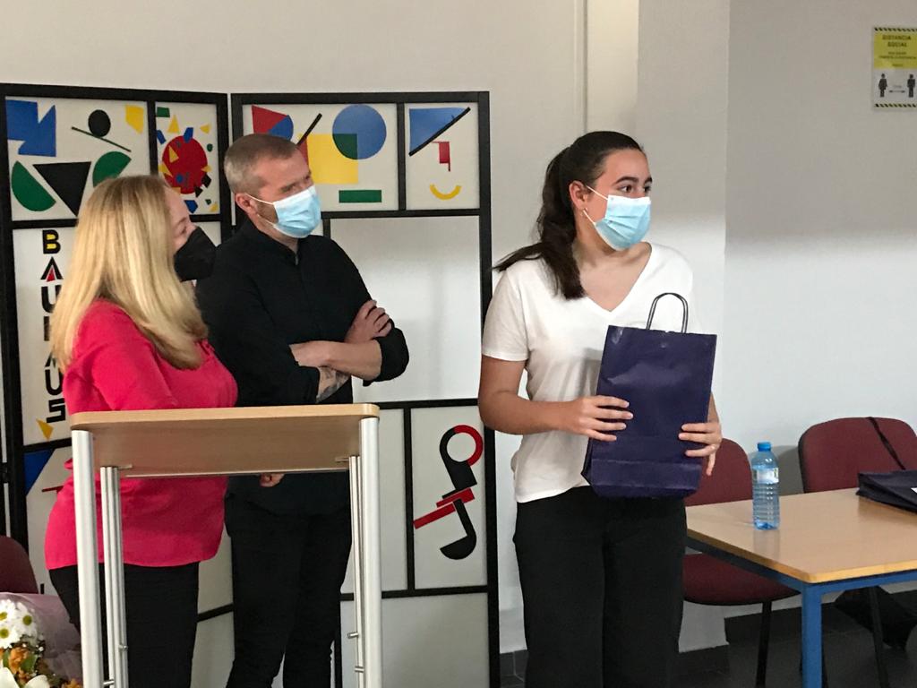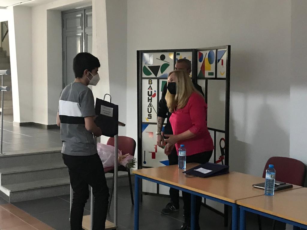 El pasado 8 de abril se entregaron los premios del XXV concurso de narración breve “Antonio Medina de Haro”, convocado por el Departamento de Lengua Castellana y Literatura. Debido a las excepcionales circunstancias en las que nos encontramos no se había podido llevar a cabo la entrega de premios que estaba prevista para el 23 de abril del año pasado. El acto, que tuvo lugar en la antesala del salón de actos, fue un acto íntimo en el que acudieron los premiados con sus respectivos acompañantes y fue presidido por Doña María Quirós, directora del IES, acompañada en esta ocasión de Juan David Medina, uno de los hijos del profesor. A pesar de que las circunstancias no han permitido que la entrega se realice como en otras ediciones no ha dejado de ser un acto emotivo en el que se ha defendido la importancia de la cultura y la literatura que se hace más especial, si cabe, en
