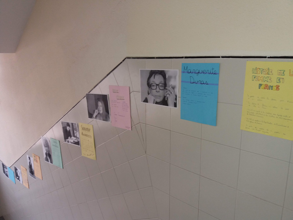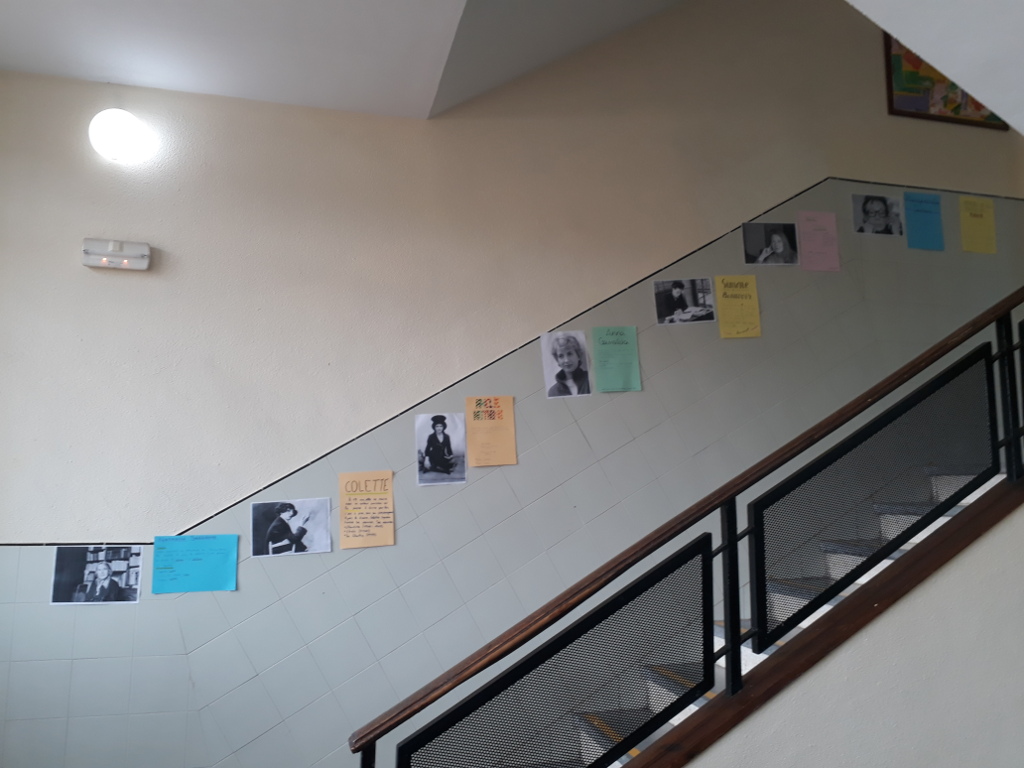 El alumnado ha trabajado en francés información acerca de las autoras y luego han escrito en las distintas cartulinas que han expuesto en las escaleras principales del centro: