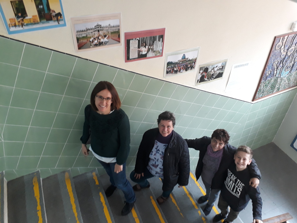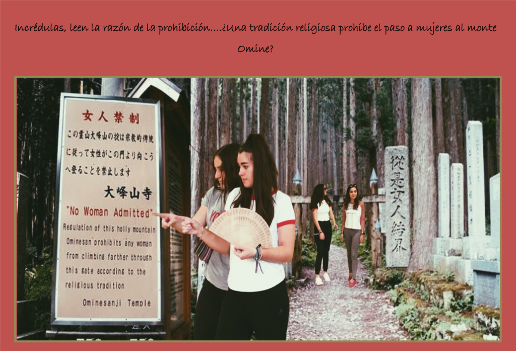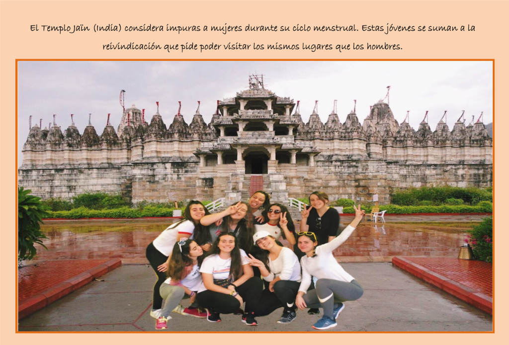 La profesora de Francés Dª. Rosa Belén Galván junto con sus alumnas de bachillerato, continuó llenando las escaleras principales con imágenes de ellas en lugares que hoy en día están prohibidos para las mujeres. Un trabajo cargado de una reivindicación bonita y justa. Las razones de las prohibiciones son religiosas en su mayoría, considerando a las mujeres impuras por estar en edad reproductiva y tener su menstruación. El texto que ha acompañado a las fotos es el siguiente: