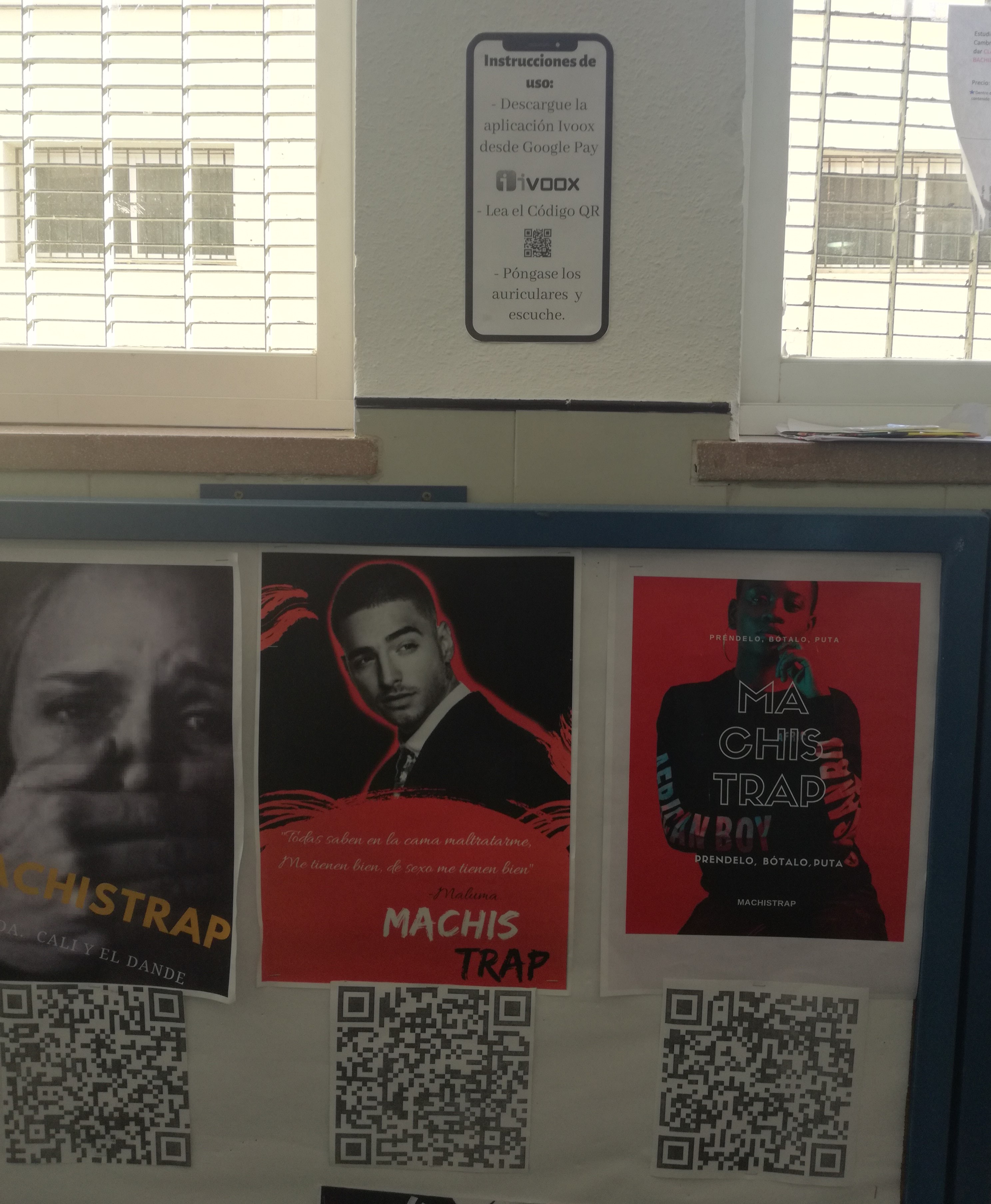Estos carteles han sido acompañados de un código QR, que conduce a un audio donde se realiza el análisis lingüístico de la canción de donde nace la particularidad de sus carteles. Así, el alumnado hace visible y significativo el contenido negativo de las canciones que acostumbran a consumir a la totalidad del IES Cristóbal de Monroy. En los siguientes enlaces se puede encontrar este material: