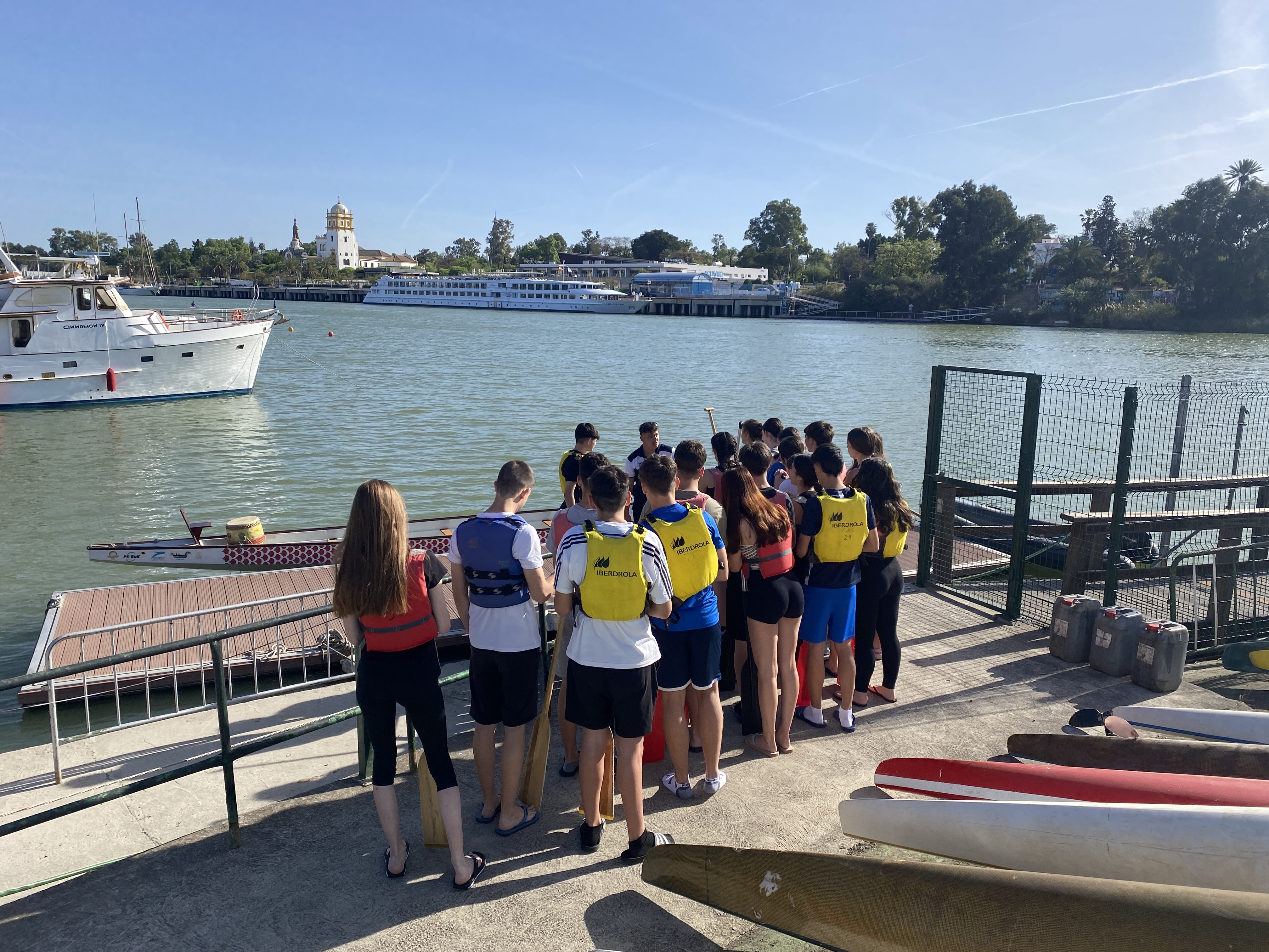 42 alumnos/as junto con los profesores de Educación Física acuden al Club Náutico de Sevilla para realizar deportes de agua como kayak, paddle surf y «Dragon Boat». 4 horas de actividad en la que el alumnado en dos grandes grupos, en un primer tiempo practicaron kayak y paddle surf por parejas y un segundo tiempo donde en gran grupo, se movieron a lo largo del río Guadalquivir en una barca de grandes dimensiones desde el embarcadero del club hasta llegar a la Torre del Oro.