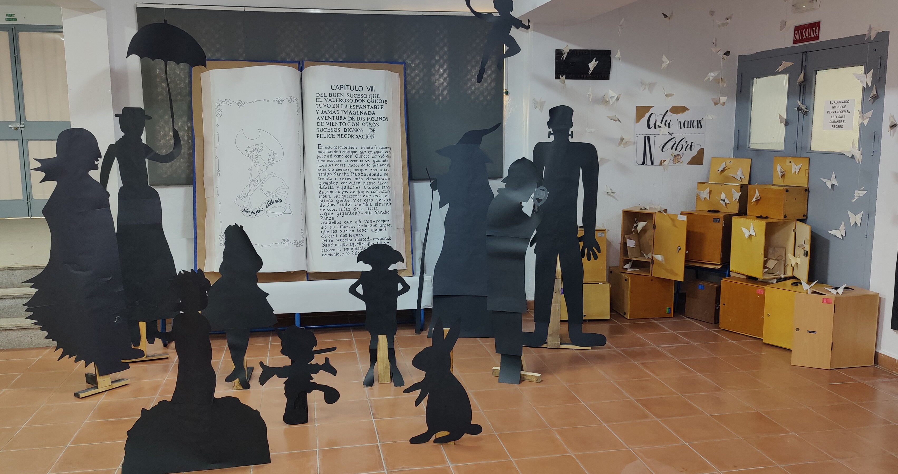 Hemos abierto las páginas de su magistral e inmortal creación y, de forma intencionada, la hemos convertido en un símbolo que representa a todos los libros: los que han sido, los que son y los que serán. Por ello, le hemos dado un lugar preferente y, como en una suerte de metáfora, de sus páginas salen a pasear los protagonistas de tantas y tantas historias que nos han hecho disfrutar. ¿Cómo? Dándoles la oportunidad de asomarse entre los cientos de hojas y las miles de palabras, de atisbar nuestro mundo y de ocupar un espacio nuevo y desconocido: nuestro instituto. Que no tengan miedo. Que no se preocupen. Nosotros les damos cobijo. Sí, estos días en la antesala del salón de actos, que se ha poblado de figuras literarias, podremos cruzarnos con algunos de ellos.